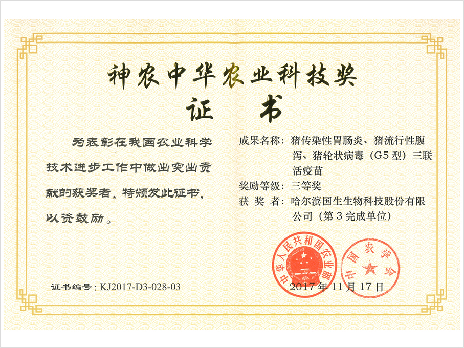 公司简介 荣誉资质 机构设置 联系我们 科学技术奖 一等(发明) 猪传染性胃肠... 神农中华农业科技奖 三等奖 猪传染性胃肠... 科学技术奖 一等(进步) 禽重要免疫抑制... 规模化牛场主要呼吸道传染病防控技术及产品... 国家技术发明奖证书 杰出科技创新奖 禽白血病综合防控关键技术... < 123456 > 您可能感兴趣的! 公司简介 行业内唯一拥有专门从事诊断制品生产和销售的GMP生产车间的企业 销售网络 一张描绘着国生生物的扩展蓝图延伸开来 专家团队 每一种药物和疫苗背后,都有一支业内顶尖的研发团队。